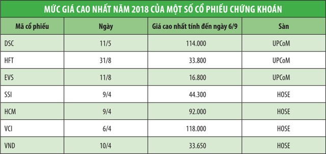 Trong quý II/2018, thị trường chứng kiến đà giảm mạnh của giá cổ phiếu ngành chứng khoán, trong đó nhiều “ông lớn” giảm trên 30%. Chẳng hạn, cổ phiếu VND của Công ty Chứng khoán VNDIRECT giảm 41,3%, từ 29.550 đồng/cổ phiếu ngày 2/4 xuống 17.350 đồng/cổ phiếu khi kết thúc quý II.