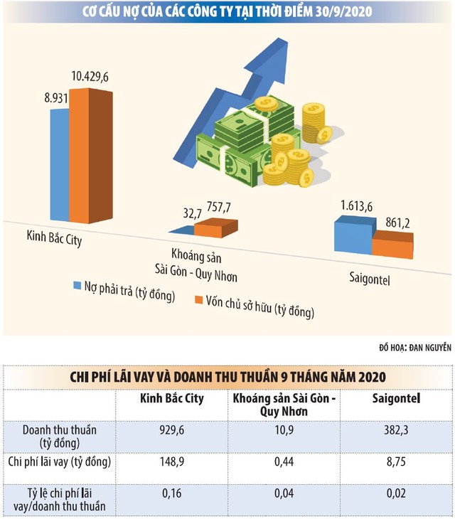 Theo báo cáo tài chính quý III/2020, Kinh Bắc City có nợ phải trả là 8.931 tỷ đồng, thấp hơn so với vốn chủ sở hữu là 10.429,6 tỷ đồng tại cùng thời điểm, tỷ lệ nợ trên vốn chủ sở hữu chỉ là 0,86 lần. Trong khi đó, cùng thời điểm, con số này ở Saigontel lên tới khoảng 1,87 lần (nợ phải trả là 1.613,6 tỷ đồng, vốn chủ sở hữu là 861,2 tỷ đồng).