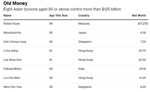 Chuyện các tỷ phú lớn tuổi nằm trong top giàu nhất thế giới không đáng ngạc nhiên, do việc tích lũy khối lượng lớn tài sản cần thời gian khá dài. Trong nhóm 500 tỷ phú giàu nhất thế giới được Bloomberg theo dõi, khoảng một phần năm từ 80 tuổi trở lên và 21 người hơn 90 tuổi. Trong đó có 8 đại diện châu Á, với tổng tài sản 125 tỷ USD.