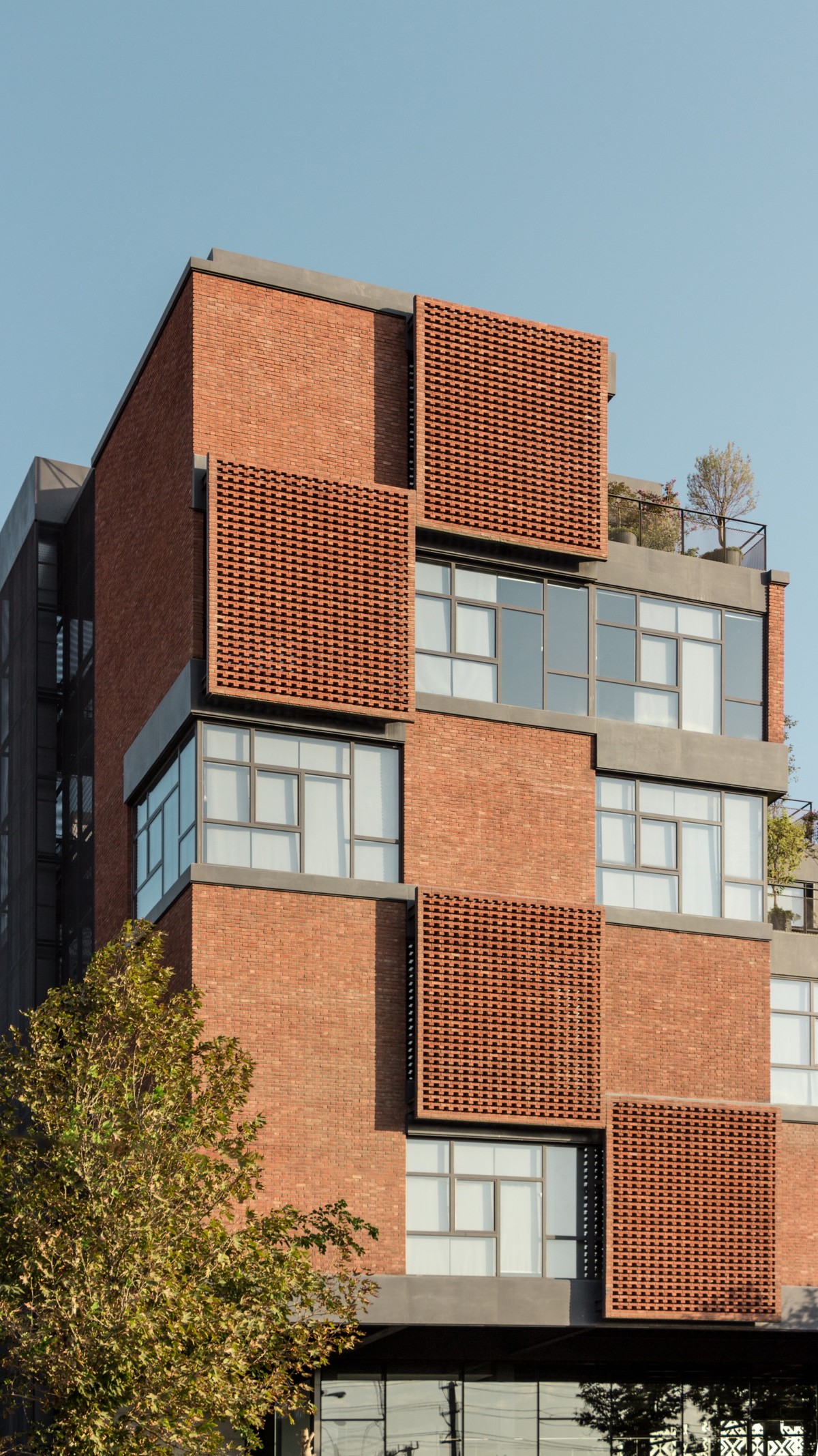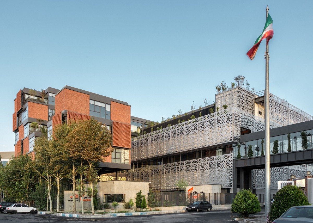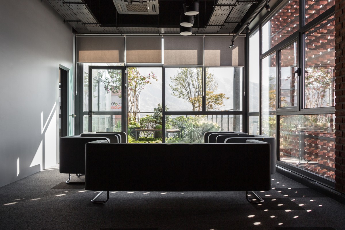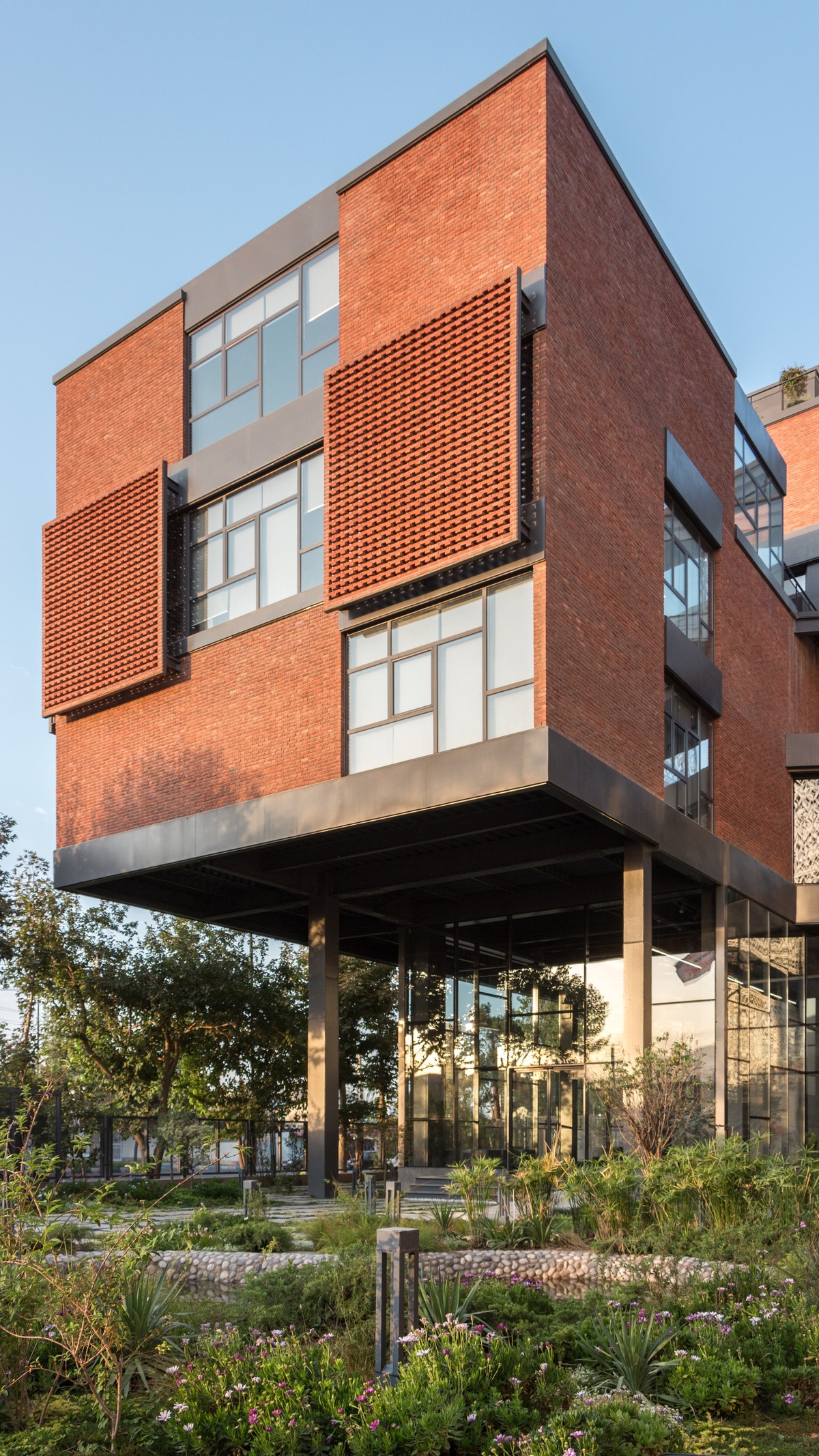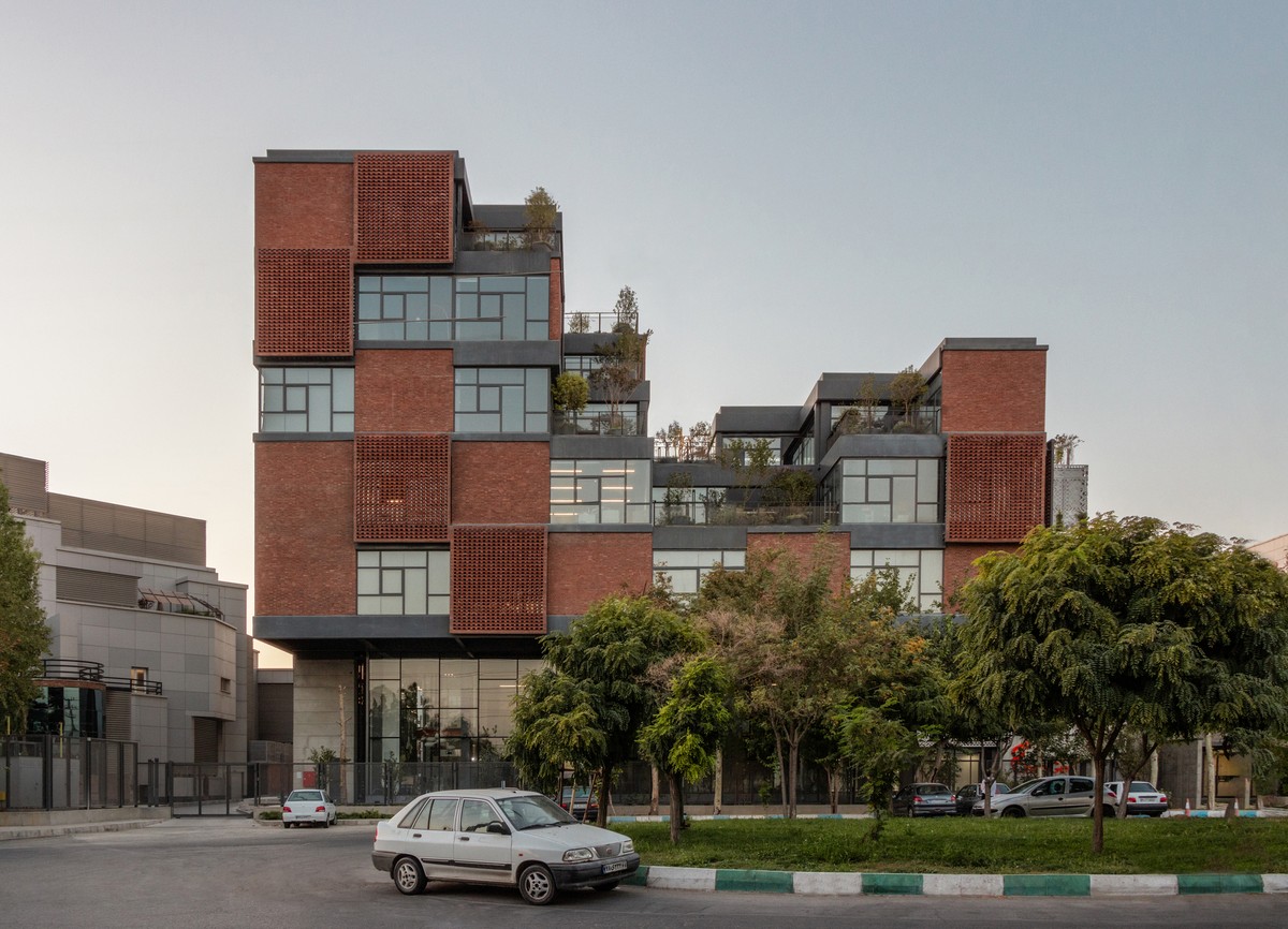 Bên ngoài toà nhà, các khối hình vuông nổi bật được lắp đặt đan xen, các khối gạch nung kết hợp cùng khối kính trắng tạo nên không gian mở nơi nhân viên có thể hít thở và tận hưởng bầu không khí thoáng đãng, nhất là khi kết hợp cùng các khoảnh đất trồng cây nhỏ nội khối.