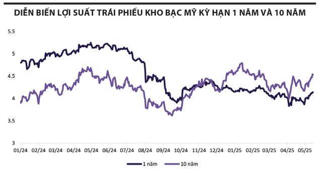 Hai là, nợ công Mỹ lập kỷ lục mới và Mỹ có kế hoạch đảo nợ cho khoảng một phần ba (9.300 tỷ USD) trong tổng số nợ hiện tại do công chúng nắm giữ dự kiến sẽ đáo hạn trong khoảng thời gian từ quý II/2025 đến hết quý I/2026. Đồng thời, nhà phát hành muốn kéo dài kỳ hạn của trái phiếu mới lên 5 - 10 năm so với kỳ hạn ngắn hiện tại của trái phiếu đáo hạn, gây áp lực lên trái phiếu kỳ hạn dài.