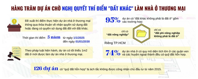 Thực tế, các dự án nhà ở thương mại thường được triển khai thông qua việc nhận chuyển nhượng quyền sử dụng đất hoặc đã có quyền sử dụng đất, đặc biệt tập trung tại những địa phương có kinh tế phát triển và nhu cầu về đất ở cao. Chẳng hạn, tại TP.HCM, có 126 dự án nhà ở thương mại không đáp ứng được yêu cầu về loại đất, trong đó hơn 100 dự án chỉ có “đất ở và đất khác” và hơn 20 trường hợp có “đất khác không phải là đất ở”, dẫn đến không được công nhận chủ đầu tư. Tương tự, Hà Nội đã chấp thuận 221 dự án nhà ở thương mại qua thỏa thuận nhận chuyển nhượng quyền sử dụng đất hoặc đang có quyền sử dụng đất với đất khác, nhưng đến nay vẫn còn 189 dự án vướng mắc pháp lý.