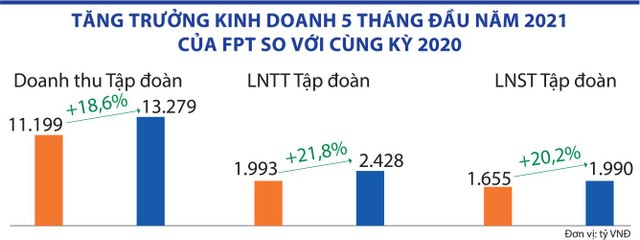 Điển hình FPT, là đơn vị dẫn đầu ngành công nghệ thông tin trong nước, chỉ số kinh doanh Tập đoàn liên tục tăng trưởng vượt bậc. Kết thúc 5 tháng đầu năm, FPT ước đạt doanh thu 13.279 tỷ đồng, tăng 18,6% (tương đương 106% kế hoạch); lợi nhuận sau thuế 1.990 tỷ đồng, tăng 20,2% so với cùng kỳ năm trước.