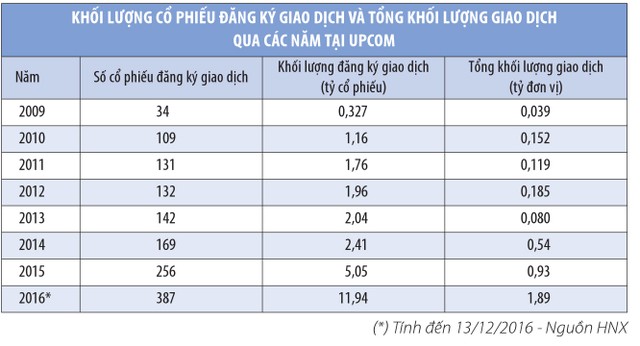 Để dễ hình dung, có thể so sánh thanh khoản của UPCoM với sàn niêm yết HNX. Cụ thể, sau 11 tháng năm 2016, vốn hóa UPCoM đã đạt hơn 250.000 tỷ đồng, gấp 1,7 lần vốn hóa thị trường niêm yết HNX, tuy nhiên, kể từ đầu năm tới ngày 13/12, tổng khối lượng giao dịch UPCoM mới đạt 1,89 tỷ đơn vị, chỉ bằng 17% khối lượng giao dịch tại HNX.