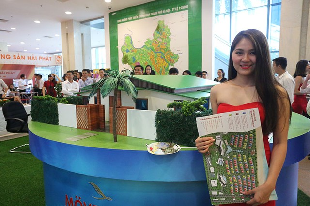 Các công ty trưng bày các mô hình dự án bất động sản cỡ lớn nhằm thu hút người xem. Trong ảnh là dự án Ngoại giao đoàn của Công ty CP dịch vụ hàng không Thăng Long