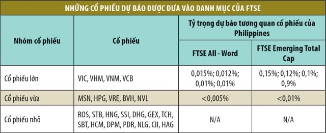 Căn cứ vào những tiêu chí lựa chọn cổ phiếu sau khi quốc gia được nâng hạng như tỷ lệ tối thiểu có quyền biểu quyết, tỷ lệ cổ phiếu tự do chuyển nhượng, tỷ lệ giới hạn đầu tư nước ngoài, thanh khoản và vốn hóa đã áp dụng với Ả Rập Xê-út ở kỳ nâng hạng tháng 9/2018, khả năng sẽ có 24 cổ phiếu Việt Nam được đưa vào danh mục của FTSE (xem bảng).