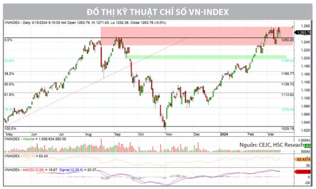 Dưới góc nhìn kỹ thuật, diễn biến rung lắc trong 2 phiên giao dịch cuối tuần qua xuất hiện khi VN-Index nhanh chóng quay trở về vùng đỉnh ngắn hạn cũ, nhưng chưa gây ra bất kỳ sự thay đổi nào về mặt xu hướng trong ngắn hạn của chỉ số chung. Với chặn trên vẫn tại đỉnh ngắn hạn cũ là 1.280 điểm thì vận động của VN-Index đang từng bước củng cố nền giá gần nhất tại 1.235 điểm, nhờ nỗ lực hồi phục trong phiên 13/3. Với khoảng biên độ rộng 40 điểm, đây là vùng dao động đủ lớn để chỉ số có thời gian củng cố và tích lũy ở vùng giá mới, đồng thời hấp thụ những lượng cung tiềm năng tích tụ liên tục trong quãng tăng lớn đến hiện tại.