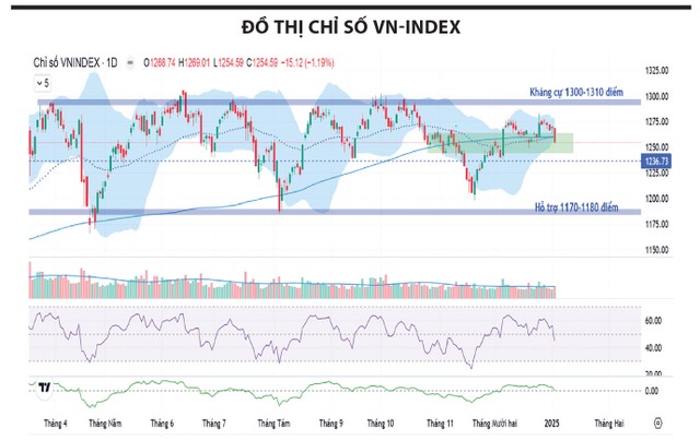 Thị trường chứng khoán tiếp tục điều chỉnh và trầm lắng trong tuần giao thoa giữa năm cũ và năm mới. Chỉ số VN-Index giằng co quanh mốc 1.270 điểm trong hai phiên đầu tuần, cũng là hai phiên cuối cùng của năm 2024. Tuy nhiên, thiếu sự dẫn dắt của các nhóm vốn hóa lớn như ngân hàng, chứng khoán và bất động sản, chỉ số chính tiếp tục điều chỉnh về vùng hỗ trợ thấp hơn, quanh 1.260 điểm trong hai phiên giao dịch cuối tuần.