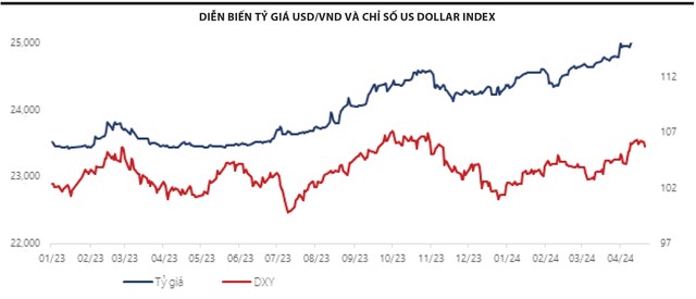 Trong nước, tỷ giá USD/VND chững lại đà tăng nhờ những động thái can thiệp kịp thời của Ngân hàng Nhà nước. Gần đây, các ngân hàng thương mại có xu hướng tăng lãi suất huy động (ít nhất 10 ngân hàng tăng lãi suất kể từ đầu tháng 5/2024, trong đó có Techcombank, VIB, Sacombank), nhưng tâm lý nhà đầu tư đang dần chấp nhận mặt bằng lãi suất mới và thị trường cũng đã chiết khấu thông tin về lãi suất, nên đây không còn là tin xấu với thị trường chứng khoán.
