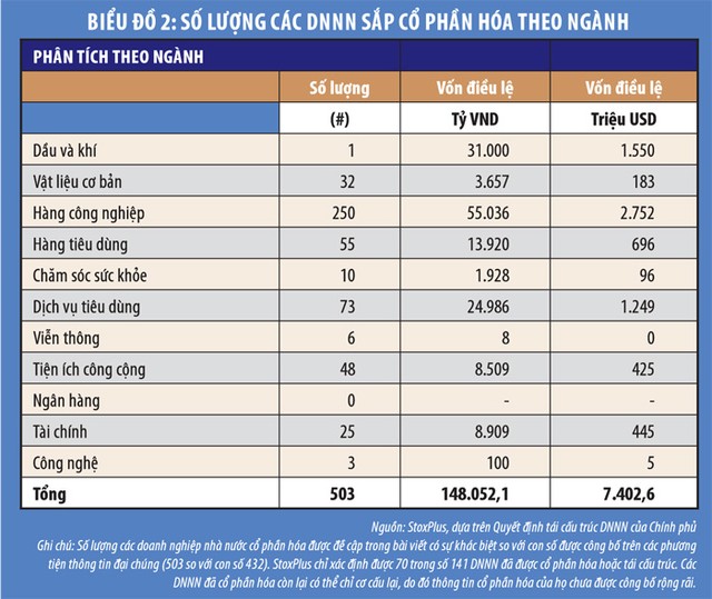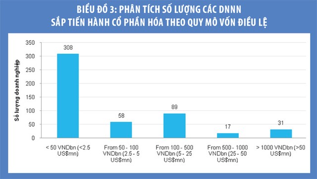 Trong số 503 doanh nghiệp sắp tiến hành cổ phần hóa, thì có 302 doanh nghiệp kinh doanh theo mô hình nhỏ lẻ, tập trung vào một địa phương cụ thể như huyện, tỉnh; và 51 DNNN có vốn điều lệ trên 25 triệu USD (Biểu đồ 3).