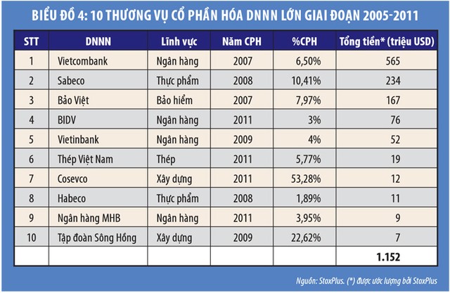 Tương tự, tổng số tiền thu về từ 10 thương vụ cổ phần hóa lớn nhất giai đoạn 2005-2011 cũng chỉ là 1,4 tỷ USD. Trong thời gian cổ phần hóa, số lượng các nhà đầu tư nước ngoài tham gia ít, nhưng đã tăng lên đáng kể trong thời kỳ hậu cổ phần hóa. Tại một số đợt cổ phần hóa lớn, các nhà đầu tư nước ngoài đã tham gia DNNN lớn có nền tảng tốt như: Vietcombank, Sabeco và Tập đoàn Bảo Việt. Tuy nhiên, tại các DNNN như Vietcombank, VietinBank, Bảo Việt, Habeco, quá trình tìm kiếm nhà đầu tư chiến lược đã xảy ra sau cổ phần hóa một vài năm.