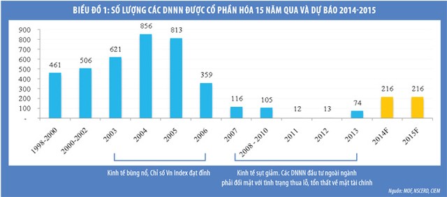 Theo số liệu từ Ủy ban Cải cách DNNN năm 2011, Việt Nam có 1.309 doanh nghiệp 100% vốn nhà nước và Chính phủ dự kiến sẽ cổ phần hóa được 573 doanh nghiệp trong giai đoạn 2011-2015. Với 99 doanh nghiệp đã cổ phần hóa tính đến cuối tháng 6/2014, hiện còn khoảng 503 doanh nghiệp cần được cổ phần hóa. Trong khi các nhà đầu tư trong nước tập trung vào các DNNN sở hữu quỹ đất lớn, thì các nhà đầu tư nước ngoài lại tỏ ra hứng thú với lĩnh vực tiêu dùng bao gồm: hàng tiêu dùng, dịch vụ tiêu dùng, chăm sóc sức khỏe, dược phẩm, dịch vụ tiện ích công cộng (Biểu đồ 2).