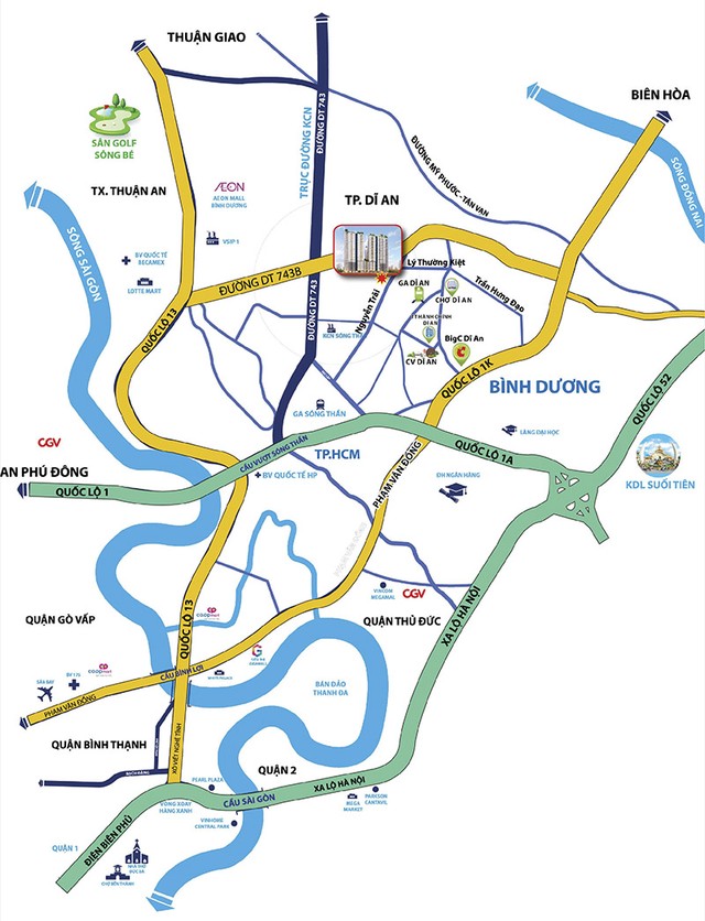 Vị trí này rất đắt địa, vừa nằm trong khu dân cư sầm uất có giao thông kết nối với giao lộ Nguyễn Trãi và Lý Thường Kiệt, cửa ngõ vào trung tâm thành phố mới Bình Dương, với khu vực nội thị Bình Dương, và qua các tuyến đường huyết mạch như Quốc lộ 1A, Quốc lộ 1K, Quốc lộ 13, PhạmVăn Đồng, Xa lộ Hà Nội… đi các tỉnh Đồng Nai – Bình Phước – TP. HCM.