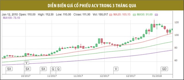 Tuy nhiên, từ ngày 11/1 đến nay, cổ phiếu ACV đã tăng trở lại mức 111.900 đồng/CP (giá chốt phiên 13/1), tương ứng tăng 7,1%. Trước đó, cổ phiếu ACV đã có chuỗi tăng ấn tượng 13 phiên liên tiếp (từ 14/12/2017 đến 2/1/2018), từ mức 86.500 đồng/CP lên 119.000 đồng/CP, tương ứng tăng 37,57%.