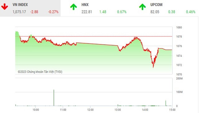 Chốt phiên, VN-Index giảm 2,88 điểm (-0,27%), xuống 1.075,17 điểm với 225 mã tăng, trong đó có 26 mã tăng trần; 167 mã giảm. Tổng khối lượng giao dịch 924,4 triệu đơn vị, giá trị 15.818,6 tỷ đồng, tương đương về khối lượng, nhưng giảm nhẹ về giá trị so với phiên hôm qua. Trong đó, giao dịch thỏa thuận đóng góp 62,6 triệu đơn vị, giá trị 1.716,8 tỷ đồng.
