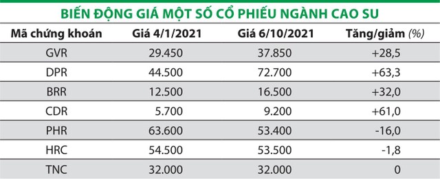 Giới phân tích nhận định, kết quả kinh doanh của các công ty cao su chủ yếu đến từ hoạt động xuất khẩu và phụ thuộc vào giá cao su thế giới. Giá cao su tăng giúp nhóm cổ phiếu này thu hút được sự quan tâm của nhà đầu tư, nhưng lợi nhuận các doanh nghiệp sẽ có sự phân hóa rõ nét. Riêng các doanh nghiệp săm lốp, triển vọng hoạt động tích cực sẽ rơi vào giai đoạn đầu năm 2022, khi nhu cầu mua ô tô dự kiến phục hồi.
