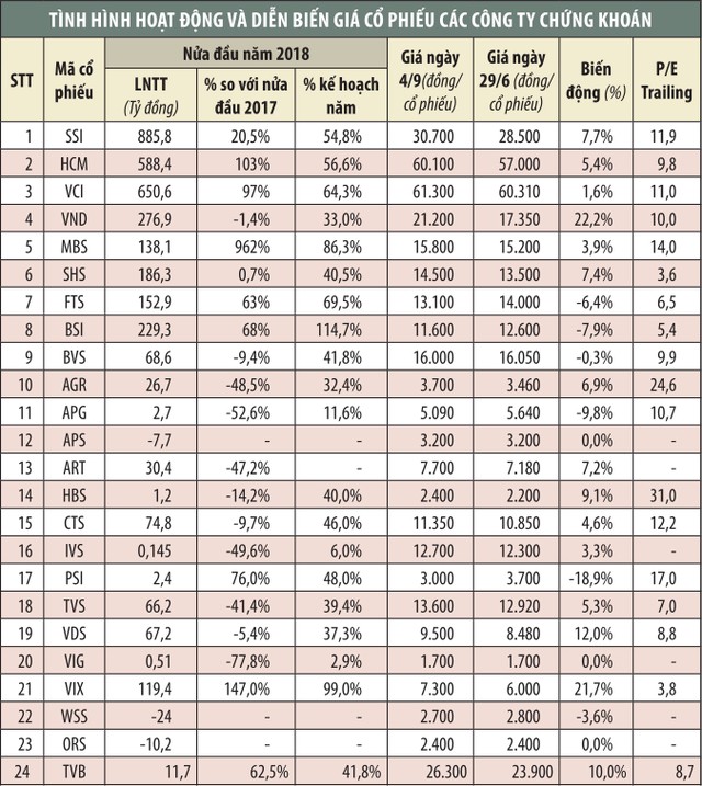 Danh mục FVTPL của VND đến cuối quý II/2018 đã giảm 12,1% so với giá trị sổ sách. Tại SHS, trong khi mức lãi của danh mục FVTPL (chiếm 22,7% tổng tài sản) giảm 18,3% thì khoản lỗ tăng 5,4%. Tại TVS, khoản đầu tư FVTPL lỗ ròng 38,9 tỷ đồng (cùng kỳ 2017 lãi 53,5 tỷ đồng), khiến lợi nhuận chung giảm mạnh.