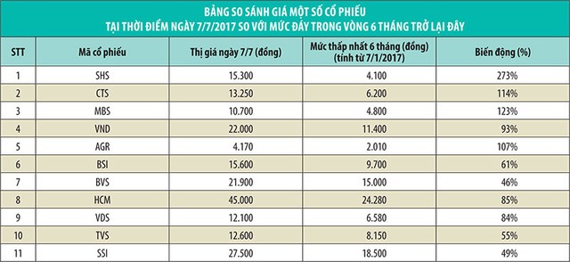 Tính từ đầu năm 2017 đến nay, nhiều cổ phiếu chứng khoán đã tăng giá hơn 100% như SHS, VND, MBS. Đà tăng của nhóm cổ phiếu chứng khoán ngoài yếu tố thị trường, thì còn nhờ kỳ vọng về hiệu quả kinh doanh tích cực của nhóm ngành này trong 6 tháng đầu năm.