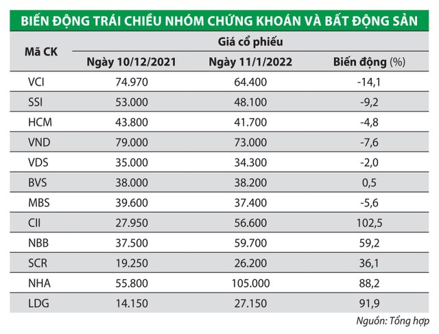 Dòng tiền chảy mạnh vào nhóm cổ phiếu địa ốc, “phớt lờ” nhiều nhóm cổ phiếu khác, trong đó có nhóm tiềm năng như chứng khoán khiến các nhóm này lình xình đi ngang hoặc giảm. Cụ thể, từ ngày 10/12/2021 đến 11/1/2022, 7 mã cổ phiếu có thanh khoản tốt nhất trong ngành chứng khoán đã giảm trung bình 6,1%.