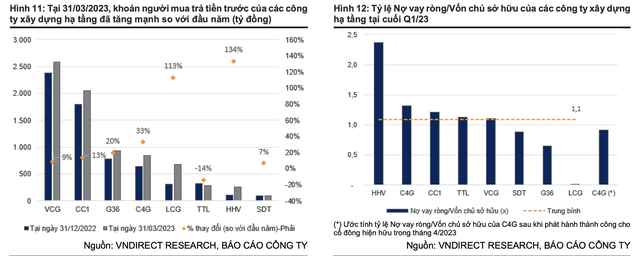 Trung bình tỷ lệ nợ vay ròng/vốn chủ sở hữu của các công ty xây dựng hạ tầng tại cuối quý I là 1,1x, đặc biệt, LCG gần như không có nợ vay ròng. Trong khi đó, do phải hợp nhất nhiều dự án BOT, tỷ lệ nợ vay ròng/vốn chủ sở hữu của HHV và C4G đang cao hơn so với trung bình ngành, đạt lần lượt 2,4x và 1,3x tại cuối quý I/2023.