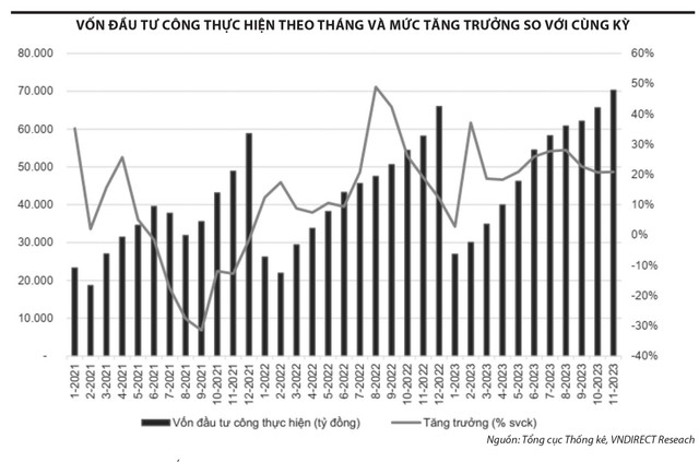 Công ty Chứng khoán VNDIRECT kỳ vọng, giải ngân đầu tư công trong năm 2023 sẽ tăng khoảng 25% và duy trì tích cực trong năm 2024. Theo kế hoạch ngân sách nhà nước năm 2024 do Bộ Tài chính cung cấp, chi đầu tư phát triển là 677.000 tỷ đồng, chưa bao gồm số dư còn phải giải ngân từ năm 2023 chuyển sang.