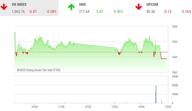 Chốt phiên, sàn HOSE có 227 mã tăng và 146 mã giảm, VN-Index giảm 0,87 điểm (-0,08%) xuống 1.063,76 điểm. Tổng khối lượng giao dịch đạt hơn 640,71 triệu đơn vị, giá trị 10.888,67 tỷ đồng, giảm 4,3% về khối lượng và 6,97% về giá trị so với phiên hôm qua. Giao dịch thỏa thuận đóng góp 44,87 triệu đơn vị, giá trị 1.463,38 tỷ đồng.