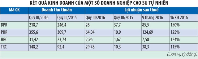 Tương tự, Ban lãnh đạo CTCP Cao su Đồng Phú (DPR) đặt kế hoạch lợi nhuận trước thuế năm 2016 là 70 tỷ đồng, bằng 36,8% lợi nhuận thực hiện năm 2015. CTCP Cao su Tây Ninh (TRC) đặt kế hoạch lợi nhuận năm 2016 giảm 40%, thậm chí kế hoạch lợi nhuận của CTCP Cao su Hòa Bình (HRC) chỉ bằng 20% năm trước đó.