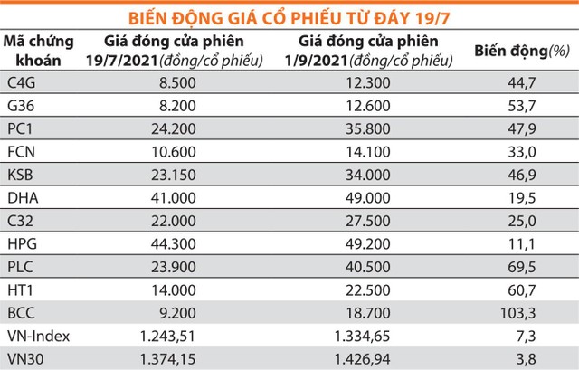 Thống kê của Đầu tư Chứng khoán với nhóm 11 cổ phiếu có độ nhạy cao nhất với sóng đầu tư công cho thấy, trung bình trong khoảng thời gian từ 19/7/2021 đến 1/9/2021, nhóm này đã đạt mức tăng bình quân 46,8%, vượt trội so với mức tăng của chỉ số VN30 là 3,8%, chỉ số VN-Index là 7,3%.