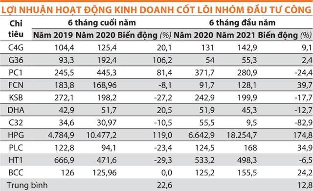 Quay trở lại thời điểm 6 tháng cuối năm 2020, sau khi Chính phủ từng bước mở cửa lại nền kinh tế sau một đợt giãn cách, các nhà đầu khi đó cũng tập trung vào nhóm cổ phiếu hưởng lợi từ chính sách đầu tư công và tạo nên một nhịp tăng mạnh từ tháng 11/2020 đến đầu tháng 1/2021. Tuy nhiên, trên thực tế, không phải tất cả doanh nghiệp trong nhóm đều có kết quả kinh doanh cải thiện. Thậm chí, một số doanh nghiệp còn suy giảm hiệu quả kinh doanh.