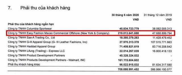 Tại ngày 30/6/2020, số dư phải thu của Công ty từ các giao dịch bán hàng cho New York & Company là khoảng 219 tỷ đồng, tương đương 9,4 triệu USD. Trong đó, số phải thu trong hạn là khoảng 55,2 tỷ và số phải thu quá hạn dưới 3 tháng là khoảng 163,8 tỷ đồng.