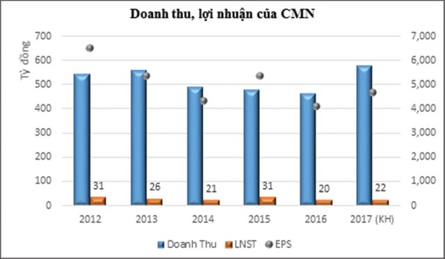 Năm 2016, sản lượng tiêu thụ của CMN đạt 14.859 tấn, giảm 8,81% so với năm 2015 (và chỉ hoàn thành 82,55% kế hoạch 2016), kéo theo doanh thu, lãi ròng giảm tương ứng 3,56% và 36,76%. Đáng chú ý, tình trạng doanh thu, lợi nhuận giảm không phải mới xảy ra, mà đã kéo dài trong suốt giai đoạn 2011-2014. Sau khi hồi phục nhẹ trong năm 2015, các kết quả đạt được đã nhanh chóng giảm trở lại trong năm 2016.