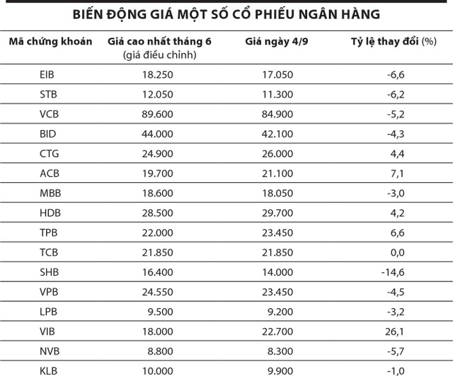 Vậy nhưng, thị giá nhiều cổ phiếu ngân hàng hiện thấp hơn mức cao từng đạt được trong tháng 6. Chỉ có một số ít mã đạt mức giá cao hơn, bao gồm VIB, ACB, TPB, CTG, HDB. Trong khi đó, không ít mã có mức giá thấp hơn tháng 6 như SHB, NAV, STB, EIB, BID, VCB…