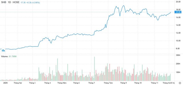 Kết thúc phiên 03/12/2025, cổ phiếu SHB tăng 2%, giao dịch ở mức giá 17.350 đồng/cổ phiếu, tiếp tục dẫn đầu thanh khoản với hơn 81 triệu đơn vị khớp lệnh. Trong đó, khối ngoại mua ròng 6,5 triệu cổ phiếu - cho thấy sức hút của cổ phiếu ngân hàng này.