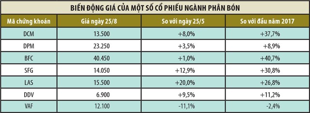 Tuy nhiên, so với thời điểm đầu năm, hầu hết cổ phiếu ngành phân bón đều có mức tăng giá khá mạnh, trong bối cảnh thị trường chứng khoán cũng như hoạt động kinh doanh của các doanh nghiệp có diễn biến khả quan.