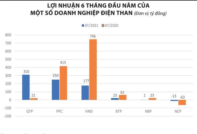 Doanh nghiệp hiếm hoi lãi cao là Công ty cổ phần Nhiệt điện Quảng Ninh (QTP). Trong 6 tháng đầu năm 2021, QTP đạt doanh thu 4,264 tỷ đồng, giảm 15%; chi phí khấu hao và chi phí tài chính giảm, còn doanh thu tài chính tăng, góp phần giúp lợi nhuận thuần từ hoạt động kinh doanh đạt 328,6 tỷ đồng, tăng 92,7% so với cùng kỳ.