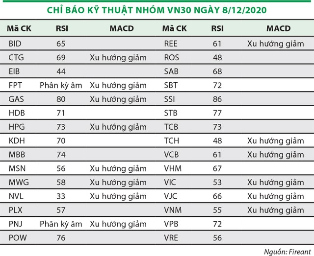 Sau giai đoạn thị trường liên tục tăng điểm kéo dài, các cổ phiếu bắt đầu bước vào vùng giá cao so với những năm trước, cũng như xuất hiện nhiều tín hiệu cảnh báo. Trong nhóm VN30, tính tới ngày 8/12/2020, có tới 20 mã cho tín hiệu đảo chiều, quá mua, chiếm 67% tổng số lượng cổ phiếu trong nhóm.