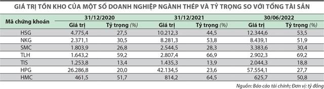 Xét về tỷ trọng tồn kho trên tổng tài sản, từ 31/12/2020 đến 30/06/2022, Công ty cổ phần Tập đoàn Hoa Sen (mã chứng khoán HSG) tăng từ 27,5% lên 53,5%; tỷ lệ này tại Công ty cổ phần Thép Nam Kim (mã chứng khoán NKG) tăng từ 30,5% lên 51,9%; tại Công ty cổ phần Thép Tiến Lên (mã chứng khoán TLH) tăng từ 10% lên 69,2%...
