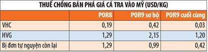 Ngoài VHC và HVG, các doanh nghiệp xuất khẩu cá khác là bị đơn tự nguyện chịu thuế suất chung là 0,42 USD/kg, giảm so với mức POR8 là 1,29 USD/kg và mức sơ bộ POR9 là 0,99 USD/kg.