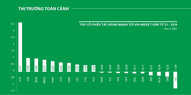 Nhóm cổ phiếu vốn hóa lớn vẫn thu hút dòng tiền, nhưng không “dẫn sóng” khi giá biến động không nhiều, thậm chí không ít mã giảm giá. Cổ phiếu đóng góp tích cực nhất vào VN-Index là VCB của Ngân hàng TMCP Ngoại thương Việt Nam, gần 3,3 điểm.