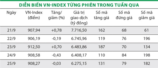 Tuần qua, chỉ số VN-Index tăng 0,8%, đóng cửa tại 908,27 điểm; chỉ số VN30 tăng 1,6%, đạt 854,71 điểm.