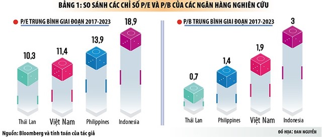 Trong giai đoạn từ năm 2017 đến nay, chỉ số P/E và P/B trung bình của các ngân hàng Việt Nam luôn thấp hơn các ngân hàng trong rổ so sánh, đặc biệt là với chỉ số P/E. Điều này có nghĩa là, nhà đầu tư luôn trả mức giá cao hơn đối với mỗi đồng thu nhập tại các ngân hàng trong khu vực.
