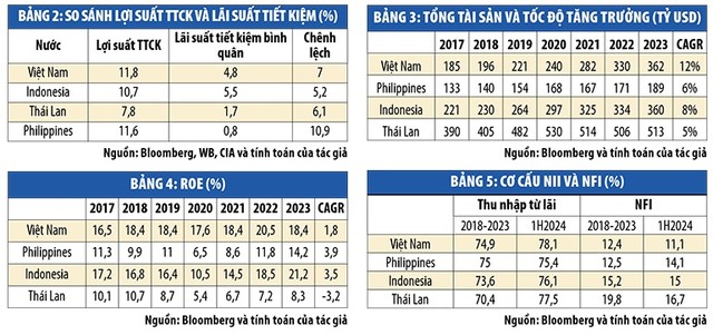 Mặc dù tổng tài sản của các ngân hàng thương mại Việt Nam chỉ bằng gần 60% tổng tài sản của các ngân hàng thương mại Thái Lan, nhưng ngang bằng các ngân hàng thương mại Indonesia và lớn hơn so với các ngân hàng thương mại Philippines (Bảng 3).
