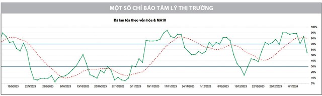 Đáng lưu ý, tâm lý thị trường dần yếu đi, đà lan tỏa ngắn hạn tạo vùng đỉnh trên 90% sau đó thất bại khi kiểm tra ngưỡng MA10 của chính mình. Áp lực điều chỉnh đến từ tất cả các nhóm ngành, trừ ngành ngân hàng vẫn cho thấy sức bền bỉ, nhiều mã duy trì sắc xanh, đặc biệt các ngân hàng có hoạt động ngân hàng bán lẻ mạnh. Sau giai đoạn dẫn dắt thị trường bứt phá, giờ đây ngân hàng đóng vai trò giữ nhịp, giúp thị trường giao dịch ổn định, không xuất hiện hiện tượng bán tháo. Tâm lý thị trường được dự báo sẽ còn nhiều lo lắng khi tuần giao dịch phái sinh với “đặc sản” biến động nhanh, mạnh, bất ngờ đã tới và tâm lý e ngại giao dịch cận Tết bao trùm.