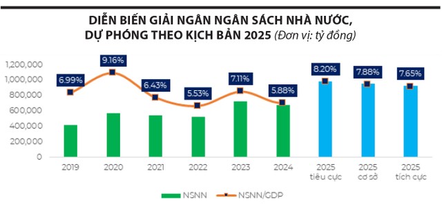 Đồ thị cho thấy, sau giai đoạn chững lại 2021 - 2024 với tỷ lệ đầu tư công/GDP dao động quanh mức 5,5 - 7,1%, ba kịch bản năm 2025 (tiêu cực, cơ sở và tích cực) đều thể hiện kỳ vọng đảo chiều rõ rệt, hướng về mức trên 7,6% GDP, riêng kịch bản tích cực đạt tới 8,2% GDP - mức cao nhất kể từ 2020. Điều này cho thấy quyết tâm lớn của Nhà nước trong việc sử dụng đầu tư công như một công cụ kích cầu chủ lực, đặc biệt thông qua các dự án hạ tầng giao thông, logistics và năng lượng trọng điểm.