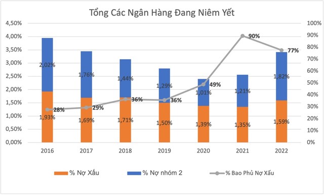 Những khó khăn của thị trường bất động sản và thị trường vốn là trái phiếu doanh nghiệp, đặc biệt từ quý 3/2022 trở đi đã phản ánh vào bảng cân đối kế toán của các ngân hàng thông qua con số nợ xấu tăng nhanh trở lại, đặc biệt là nợ nhóm 2 ở cả các ngân hàng quốc doanh lẫn ngân hàng tư nhân. Tỷ lệ nợ nhóm 2 đạt mức cao nhất kể từ 2017 đến nay và cao hơn nhiều so với năm 2020 khi có dịch Covid – 19. Đi kèm đó là tỷ lệ bao phủ nợ xấu cũng sụt giảm đáng kể so với thời điểm cuối năm 2021.