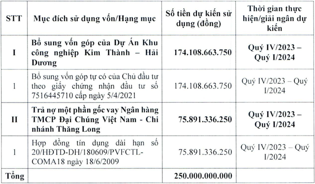Tổng số tiền thu được từ đợt chào bán dự kiến sẽ là 250 tỷ đồng. Trong đó, Công ty sẽ dùng hơn 174,1 tỷ đồng bổ sung vốn góp của Dự án KCN Kim Thành – Hải Dương, còn hơn 75,89 tỷ đồng để trả nợ một phần gốc vay ngân hàng.