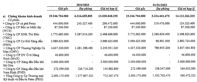 Song song đó, COM cũng dành 19,3 tỷ đồng đầu tư chứng khoán, nhưng đang phải trích lập dự phòng hơn 6,3 tỷ đồng. Trong danh mục đầu tư đến cuối tháng 6, COM dành hơn 5,77 tỷ đồng đầu tư mã TMC (trích lập dự phòng hơn 3,2 tỷ đồng); gần 4 tỷ đồng đầu tư PMS; hơn 4,6 tỷ đồng đầu tư CMV (trích lập dự phòng hơn 1,28 tỷ đồng)…