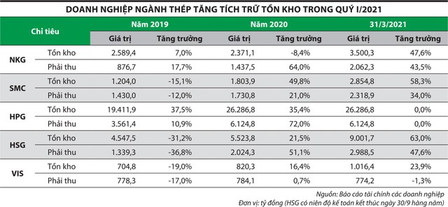 Cụ thể, tại NKG, giá trị khoản mục tồn kho thời điểm cuối quý I/2021 tăng 47,6% so với hồi đầu năm, lên 3.500,3 tỷ đồng. Tương tự, tại SMC, tồn kho tăng 58,3% so với đầu năm, lên 2.854,8 tỷ đồng. Tại VIS, tồn kho tăng 23,9%, lên 1.016,4 tỷ đồng.