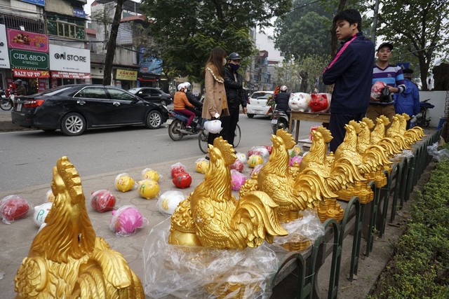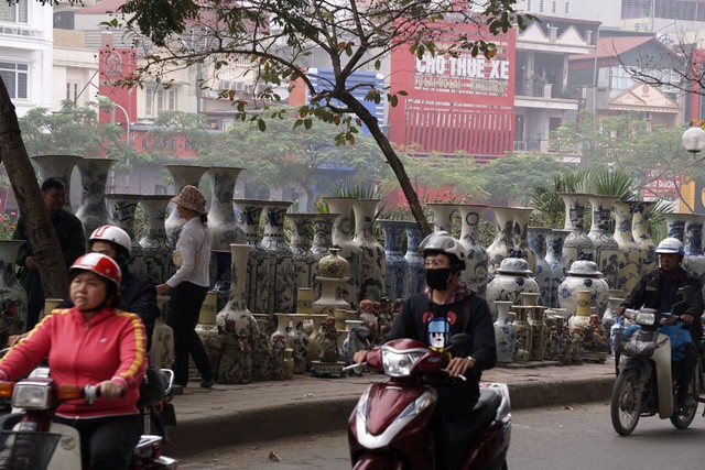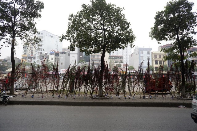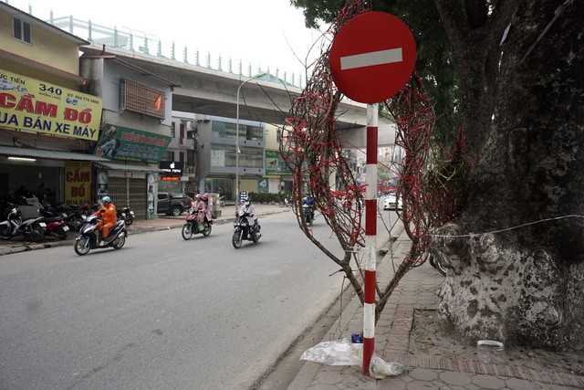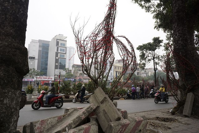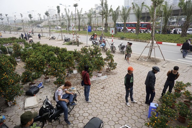 Trên suốt trục đường Láng - Bưởi - Lạc Long Quân kéo dài khoảng 10 km, đào quất đổ về bạt ngàn từ nhiều ngày nay để phục vụ người dân Hà Nội dịp Tết Nguyên đán Đinh Dậu.