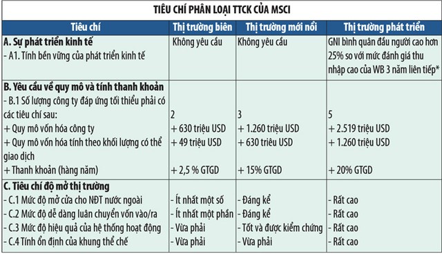 Trong các tiêu chí của MSCI, đáng chú ý là quy mô thị trường. Theo đó, để xếp vào thị trường biên, cần có ít nhất 2 công ty có vốn 512 triệu USD trở lên; để vào thị trường mới nổi cần ít nhất 3 công ty có vốn 1.032 triệu USD trở lên.